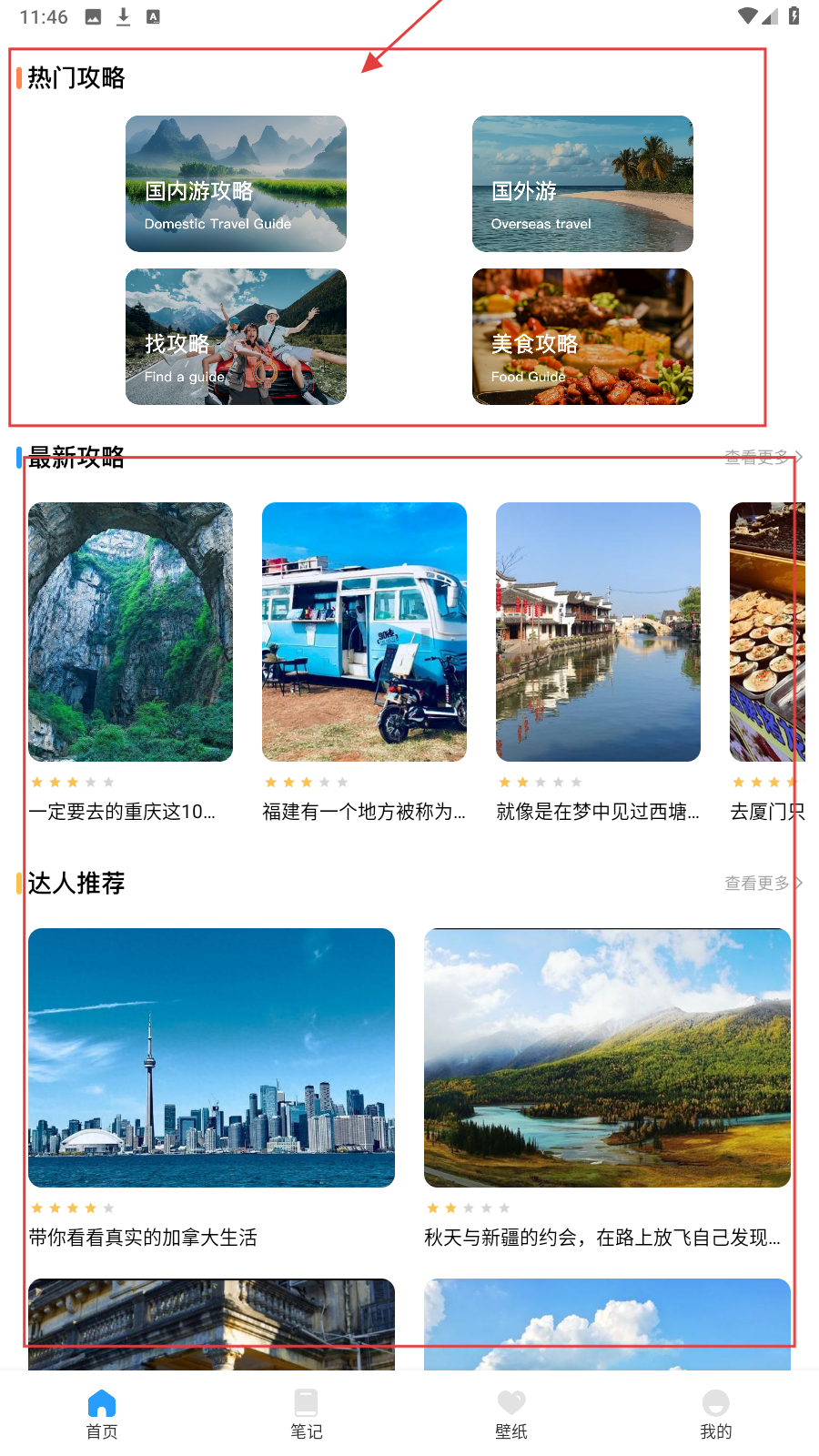 1、进入APP首页,浏览【热门攻略】分类,选感兴趣主题(国内/国外/美食等)探索。