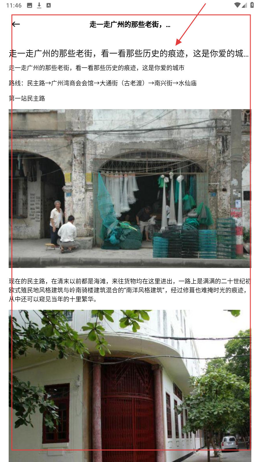 3、进入“广州老街”详情页,跟随路线指引与文字,了解历史建筑,规划实地游览。