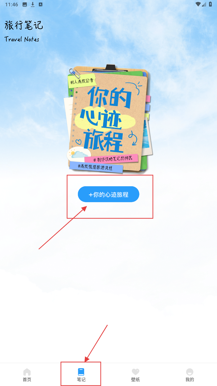 4、切换至【笔记】板块,点击【+你的心迹旅程】,记录旅行灵感与规划内容。