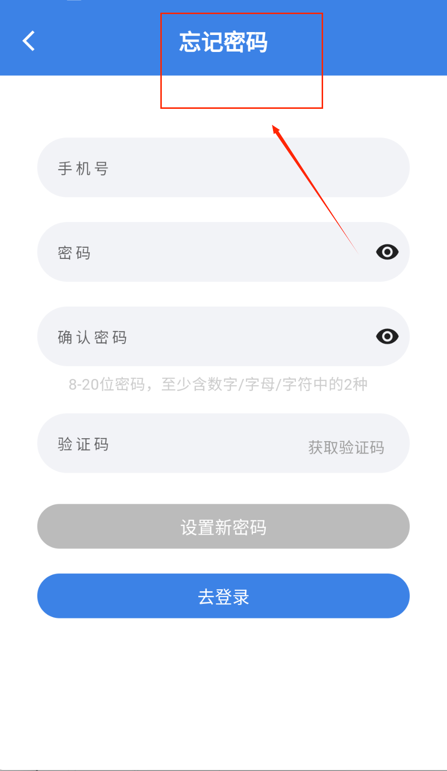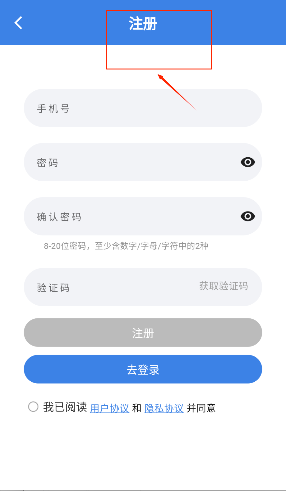 1、打开APP进入注册页,顶部蓝色标题栏显示"注册"字样,依次填写手机号、密码和验证码呀。密码需8-20位含两种字符类型。