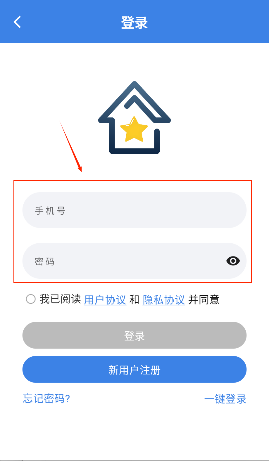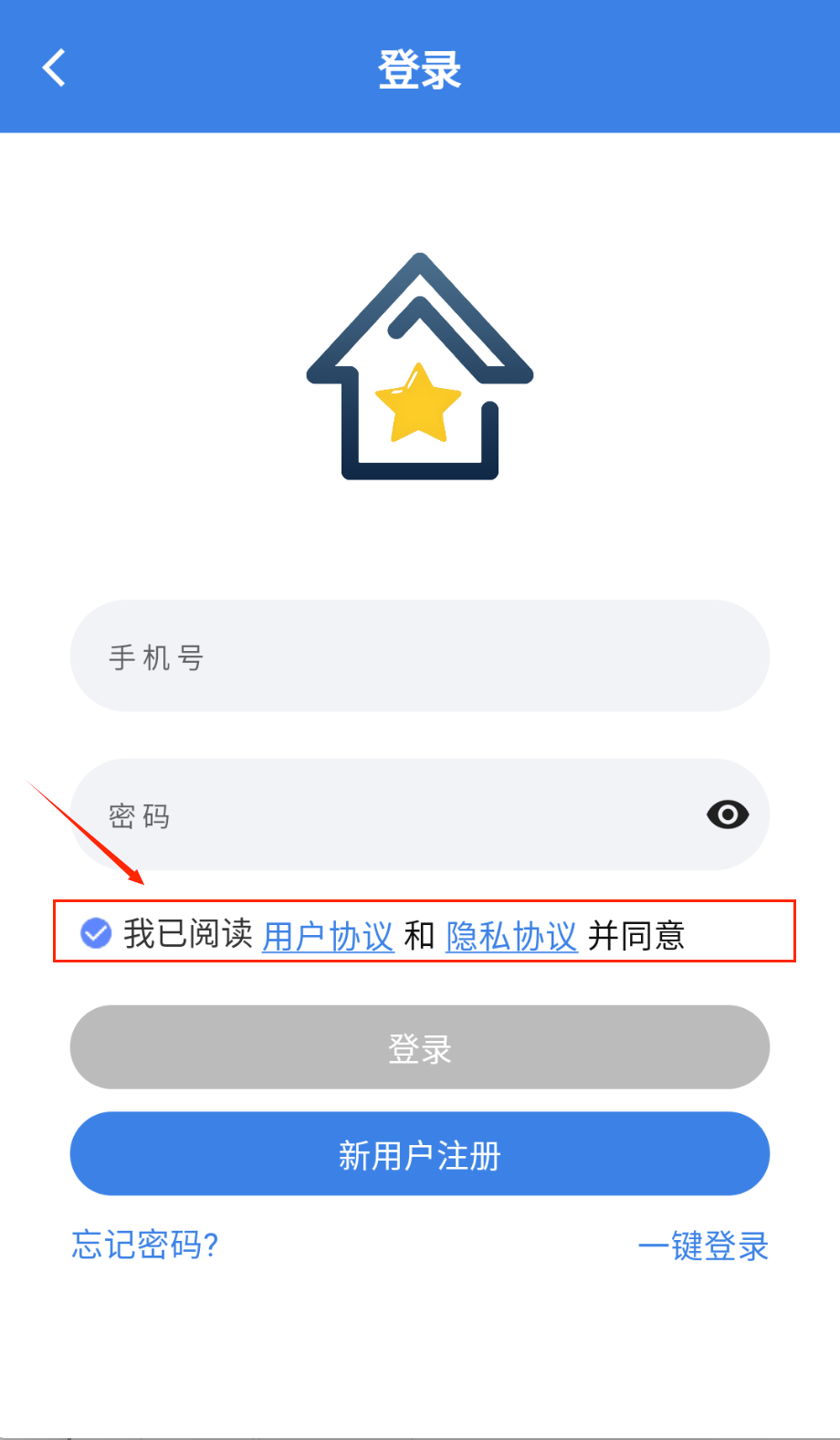 3、登录界面支持密码和验证码两种方式,输入手机号后选择登录方式呀。密码登录需勾选同意用户协议,灰色登录按钮才会变亮哦。