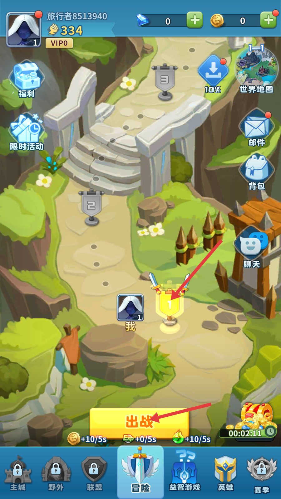 1、点击【出战】开启【1-1】冒险,关注金币+10-每秒等资源增长,积累资源为角色强化筑牢基础。