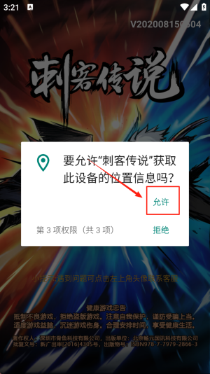 4、授权位置权限:当弹窗询问“要允许‘刺客传说’获取此设备的位置信息吗?”时,点击“允许”完成授权即可开始游戏 。