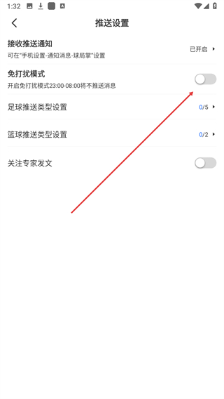 4、在推送设置页面,点击免打扰模式对应的开关。