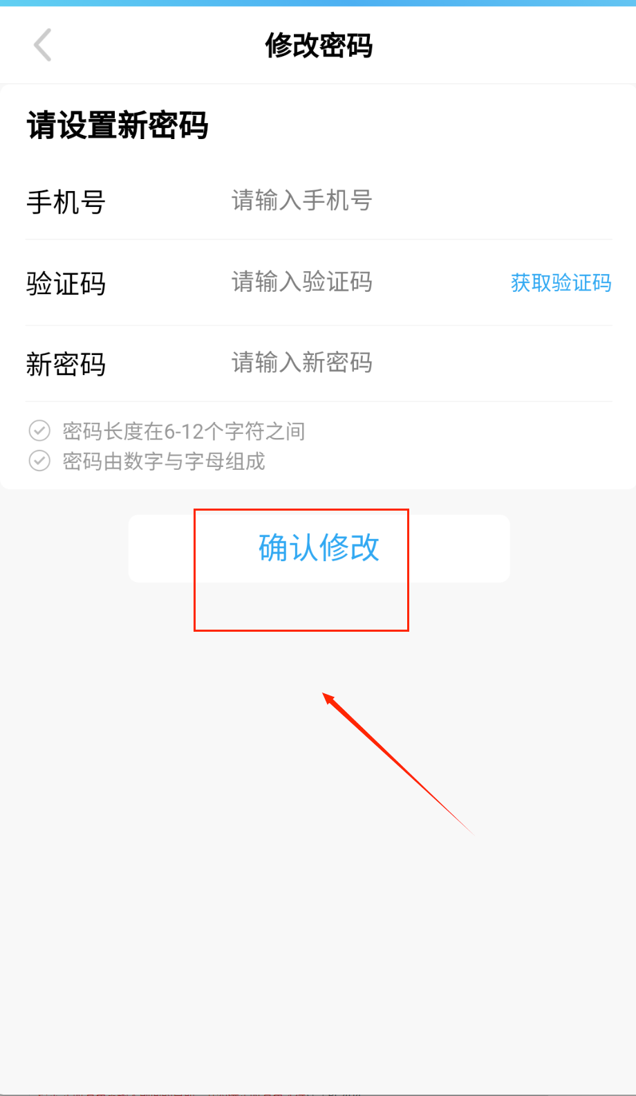 2、忘记密码可点击底部链接跳转,需输入注册手机号获取验证码,新密码要6-12位字母数字组合呀。修改成功后自动跳转登录页哟。