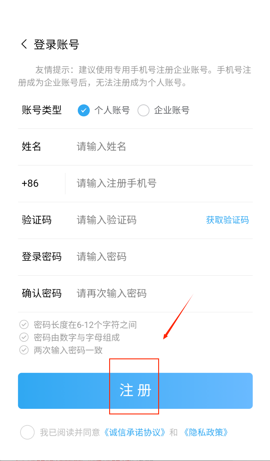 3、新用户注册建议选择企业账号,填写真实姓名和专用手机号,验证码5分钟内有效哦。密码设置需注意大小写区分啦。