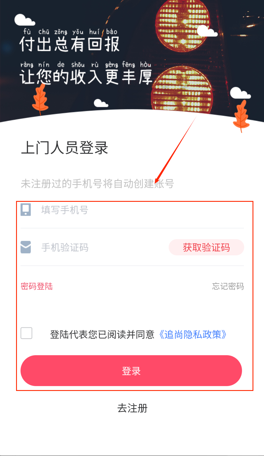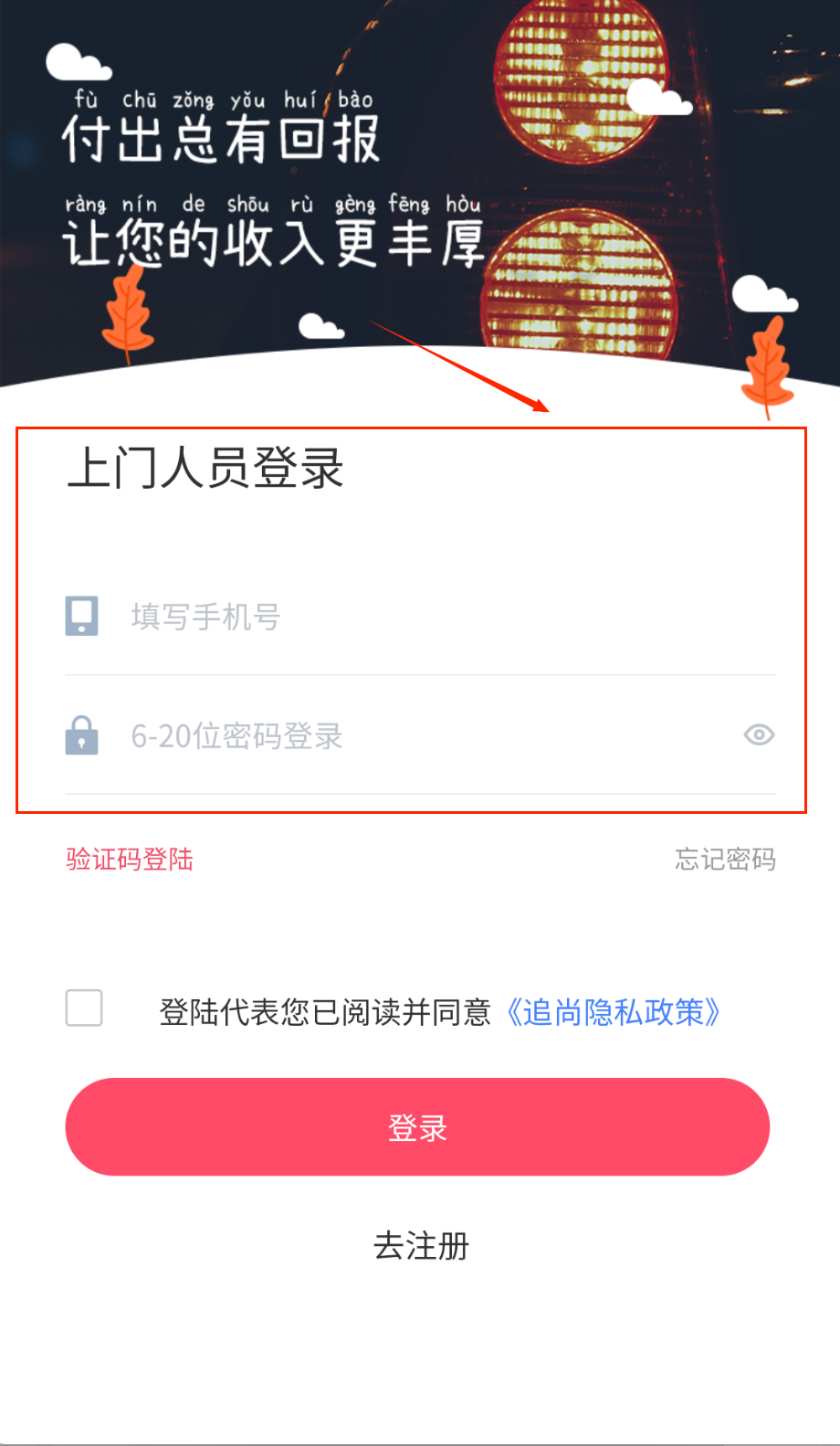 1、打开APP后看到蓝色登录界面,顶部有"付出总有回报"标语,中间是手机号和密码输入框哦。
