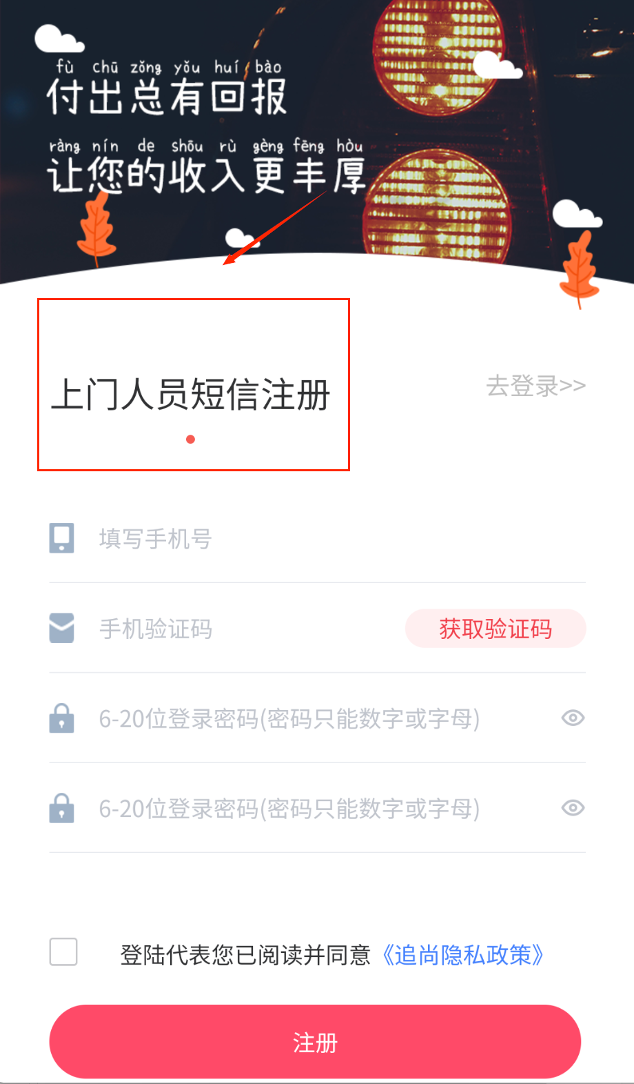 2、新用户点击"去注册"按钮,输入11位手机号获取验证码,设置6-20位数字字母密码啦。