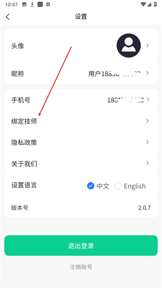 3、在设置页面中,选择绑定技师选项跳转至绑定信息填写页。