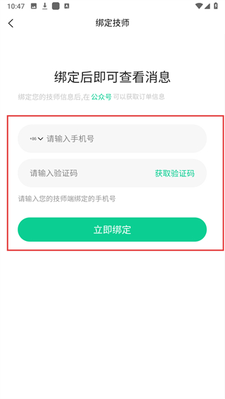 4、在绑定技师页面输入对应手机号和验证码,点击立即绑定完成。