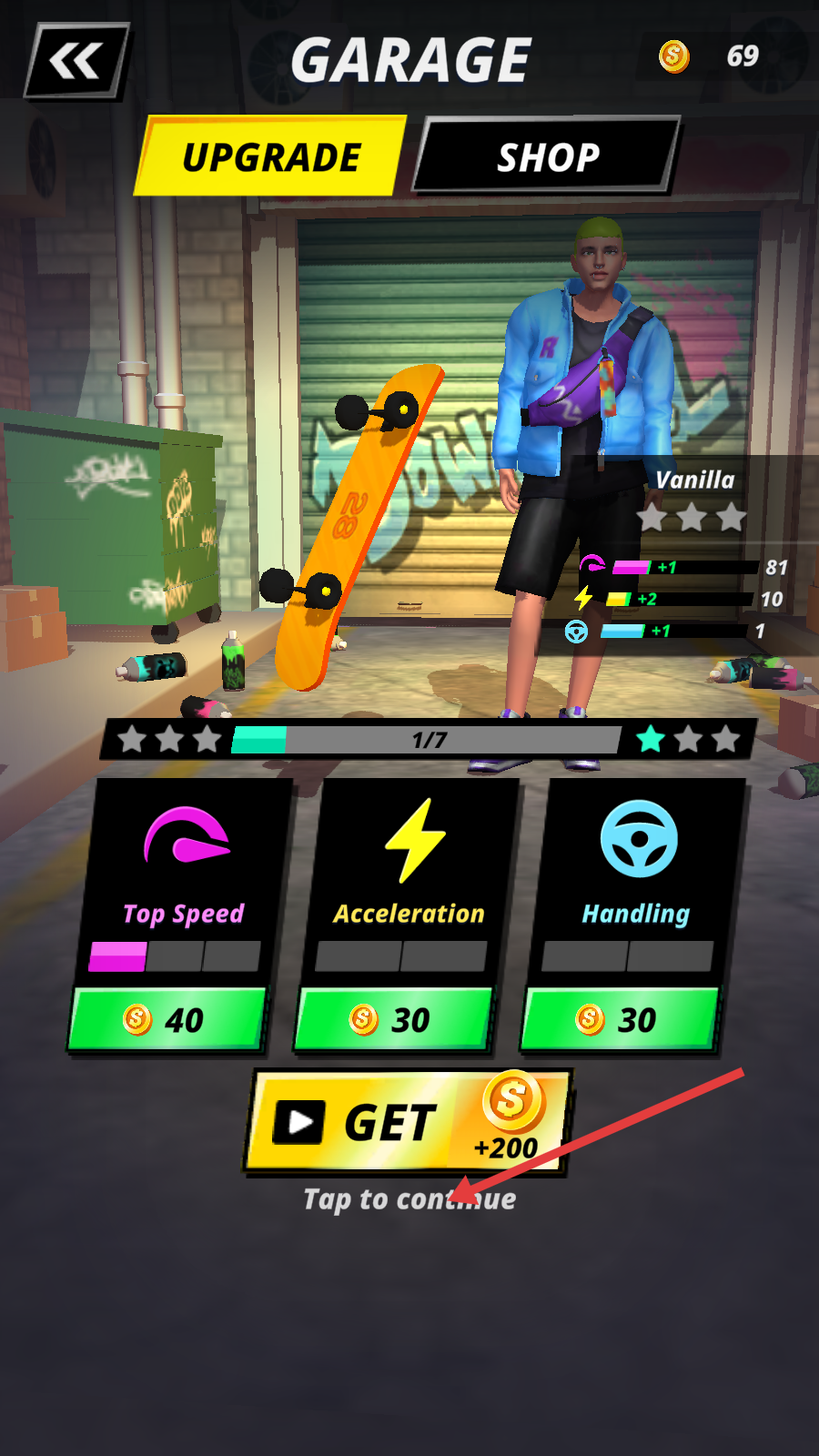 1、在【GARAGE】的【UPGRADE】页,用金币升级【Top-Speed】【Acceleration】【Handling】,点【GET-+200】赚金币强化滑板。