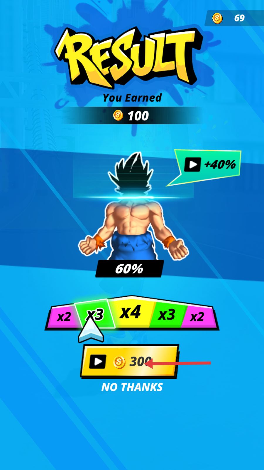4、结算时选倍数,点黄色按钮看广告领【300】金币,或直接收【100】金币,快速积累资源。