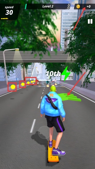 3、资源管理规划:结合金币收集强化滑板能力,合理分配资源优化装备搭配,应对关卡障碍和对手策略,争取最高得分。