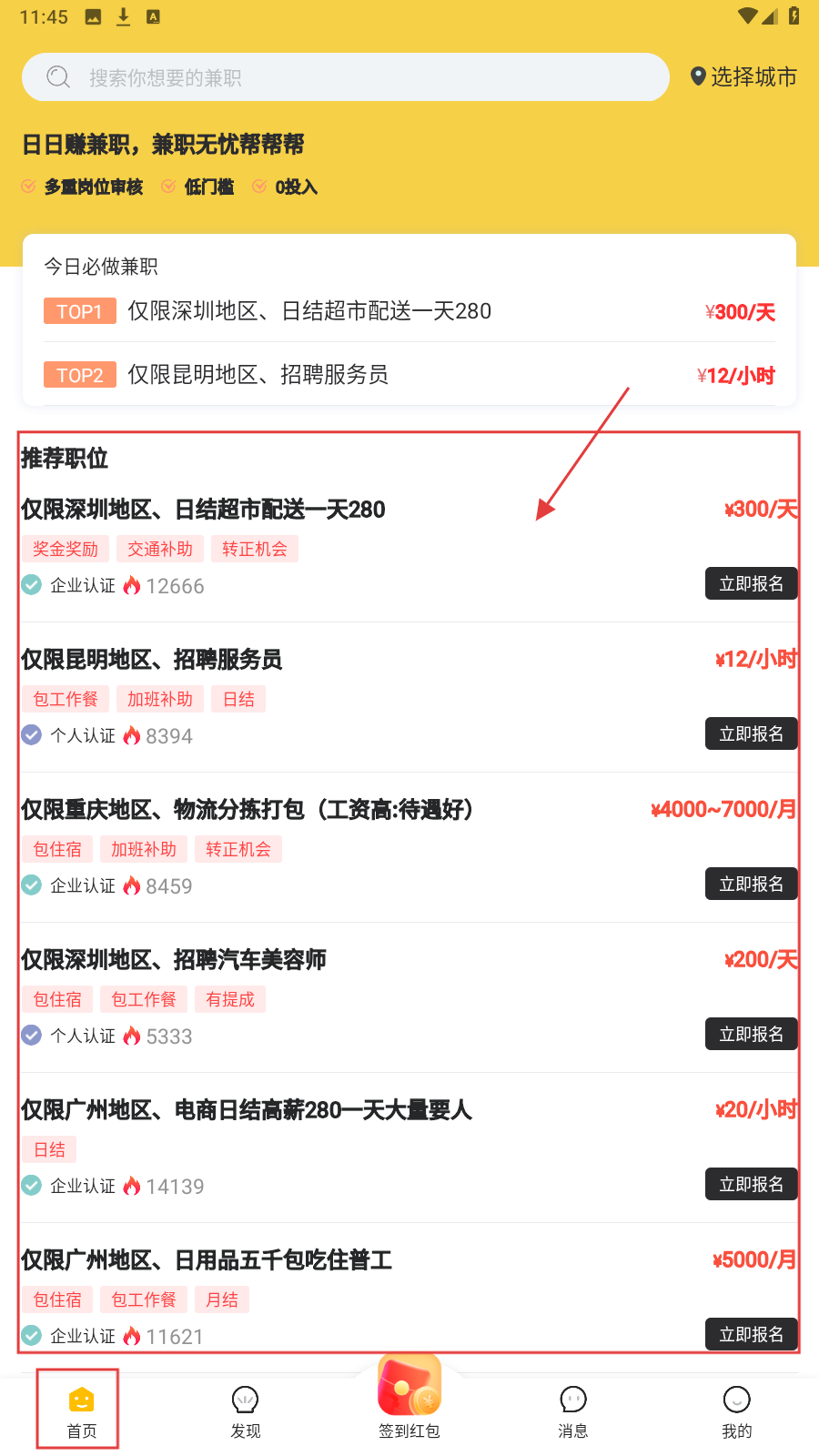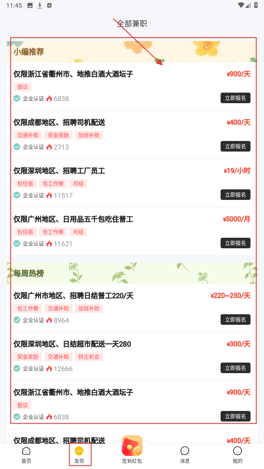 3、切换到【发现】页,逛【小编推荐】【每周热榜】,挖掘更多优质兼职。