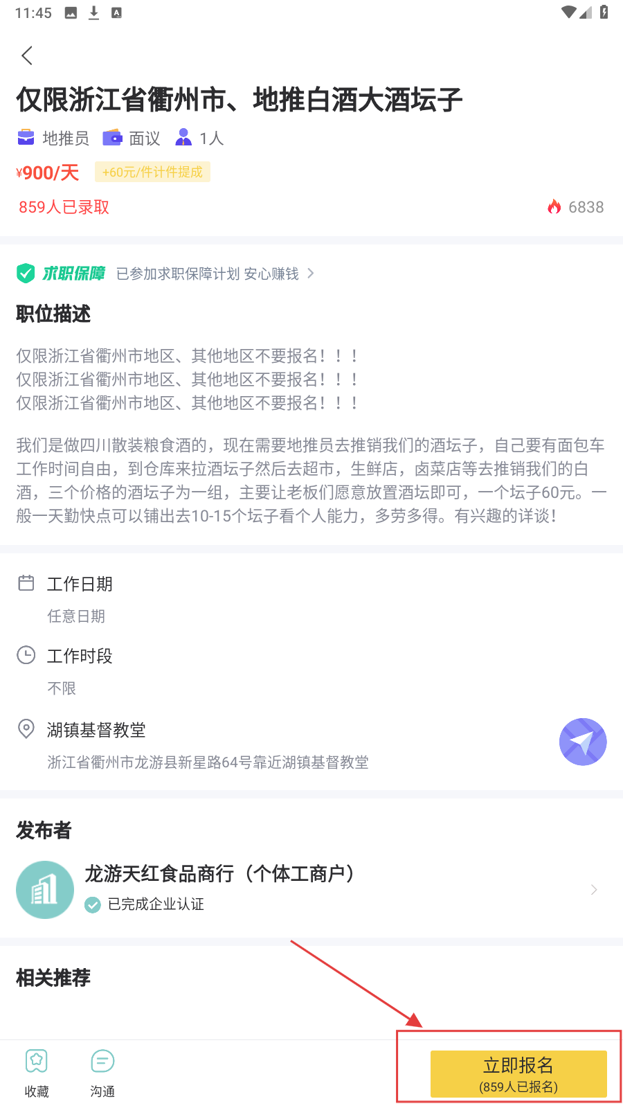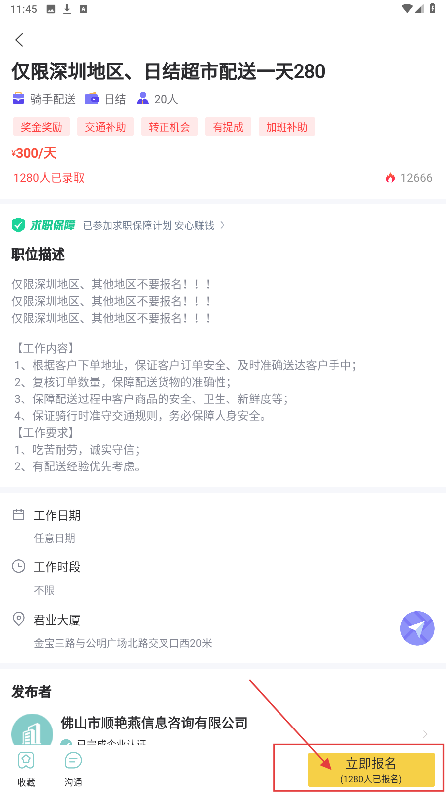 4、查看岗位详情,了解工作内容、地点等,合适就点底部【立即报名】,完成申请。