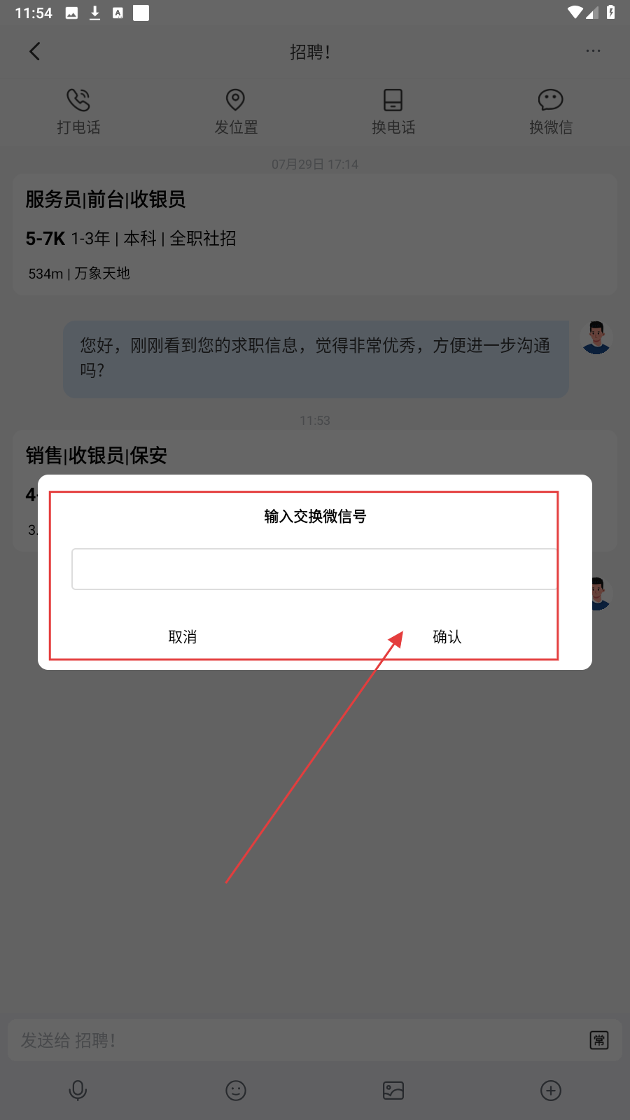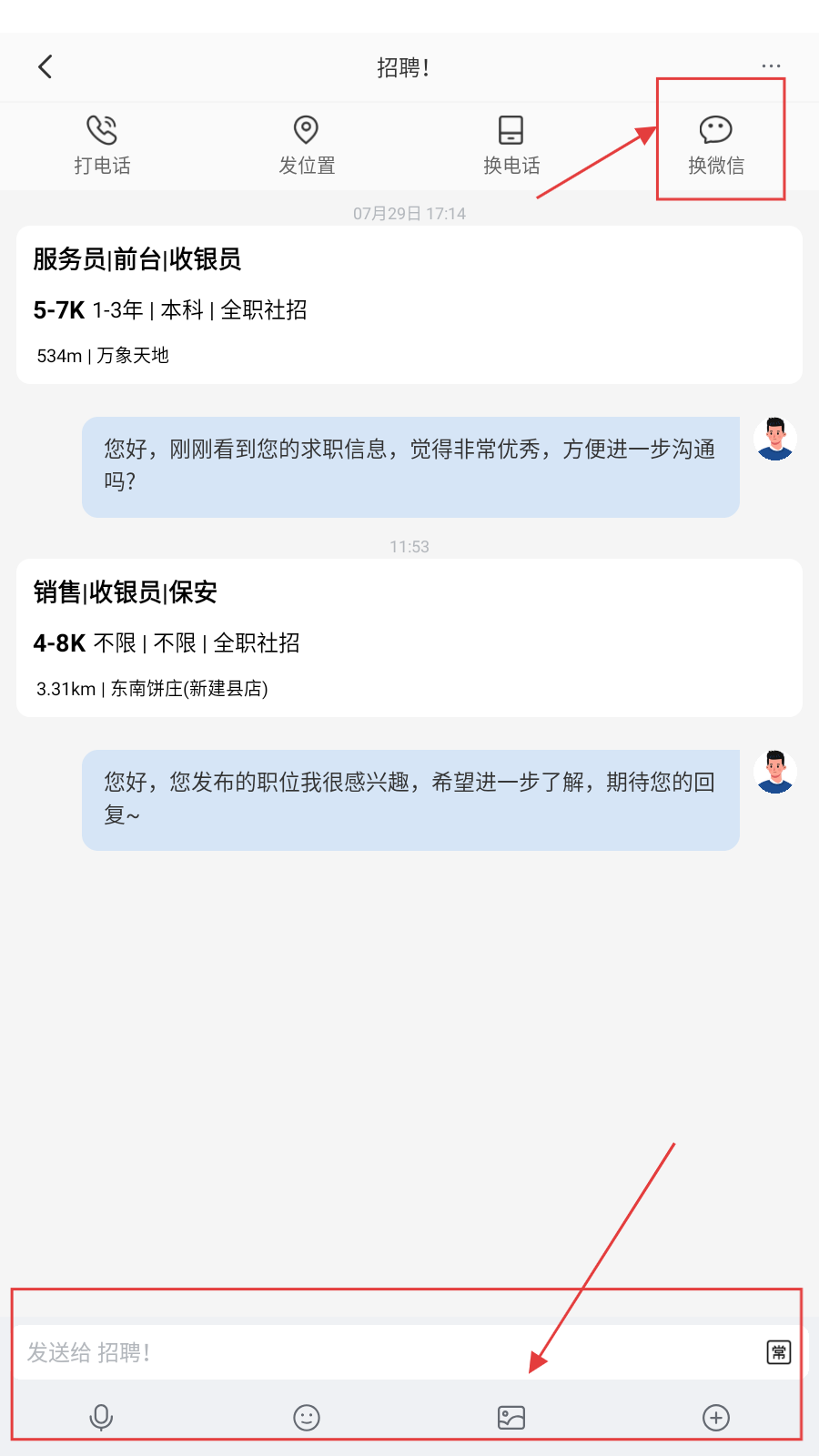 3、与招聘方沟通,点【换微信】,用底部输入栏发消息,表达对岗位兴趣盼回复。