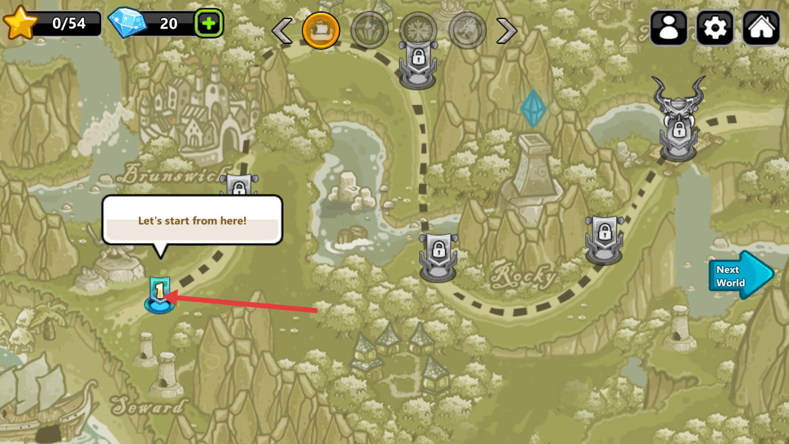 1、点击地图上标【1】的蓝色图标,跟随“Let's-start-from-here!”提示,开启冒险第一关,推进游戏进程。