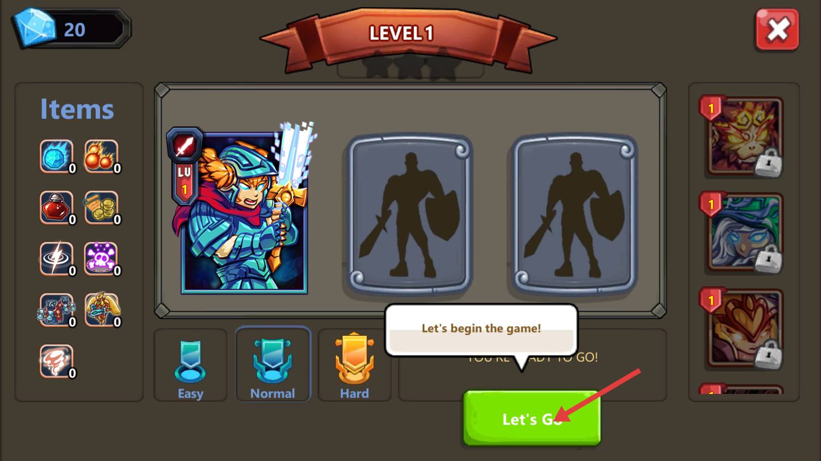 2、在【LEVEL-1】界面选难度,点击绿色【Let's-Go】按钮,进入第一关战斗,开启冒险挑战。