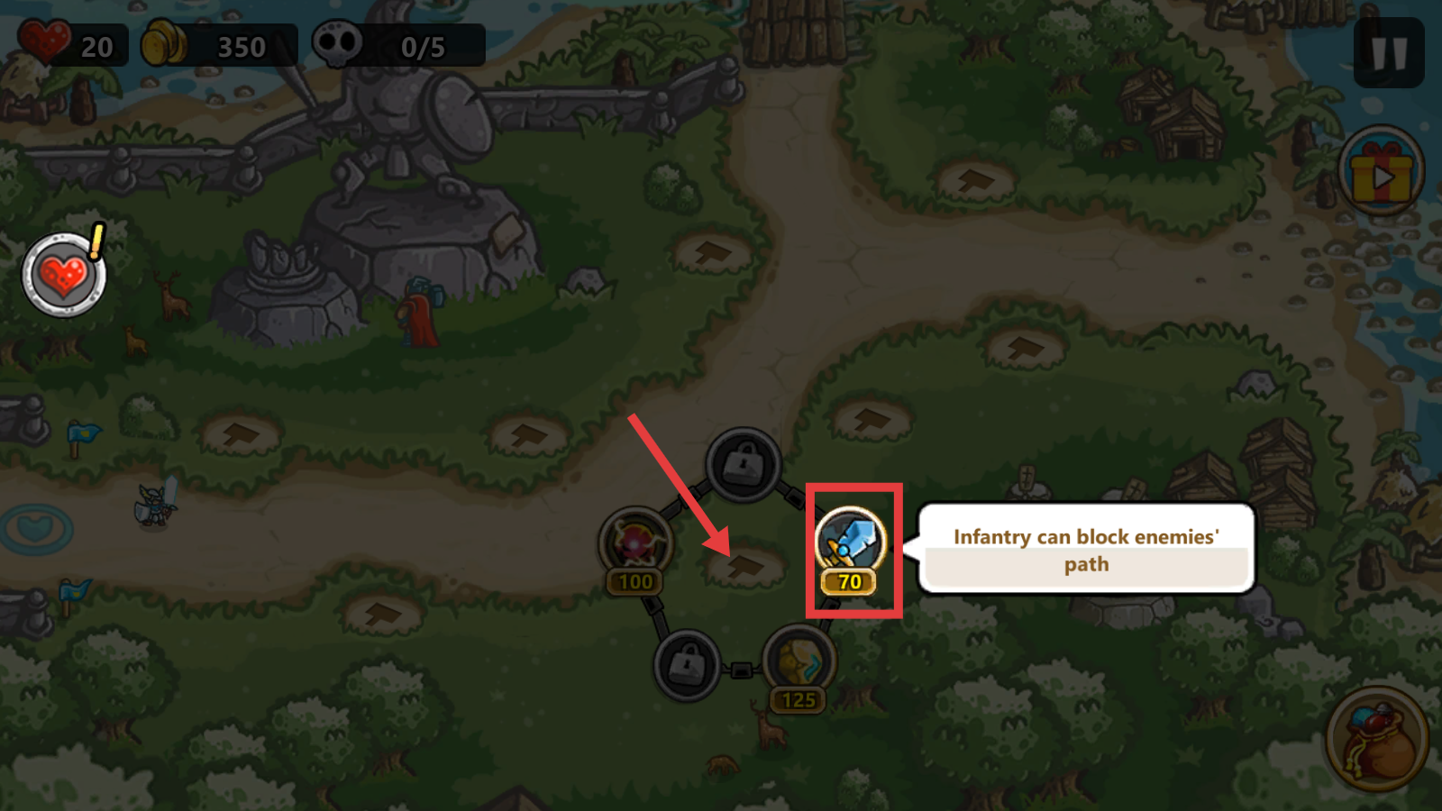 3、花费【70-金币】部署步兵,利用“Infantry-can-block-enemies'-path”特性,阻挡敌人路径,牵制对手。