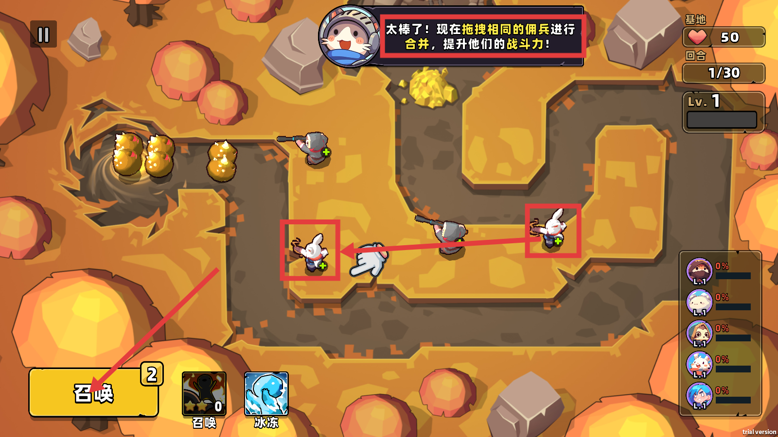 4、基础合并操作:通过拖拽完成单位两两合成,直接获得高阶佣兵强化防线,提升火力压制效率。