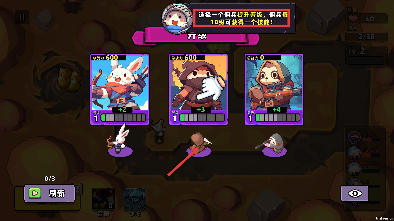 3、升级界面选佣兵提升等级,依据提示操作,佣兵每【10级】获一个技能,助力后续战斗。