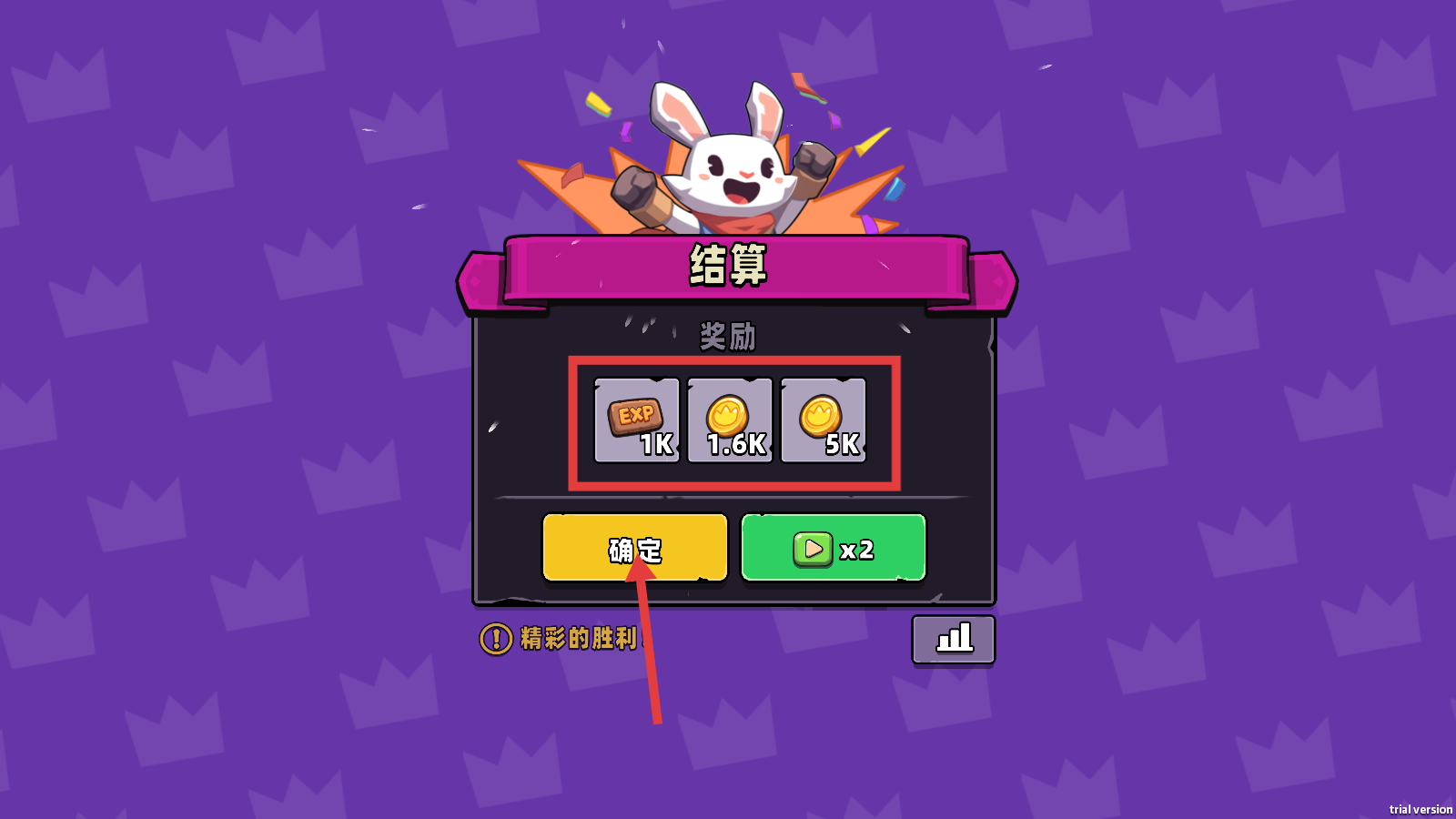 4、战斗胜利后结算,领取【1K-EXP】与【1.6K、5K-金币】,点击【确定】,获取奖励推进游戏。