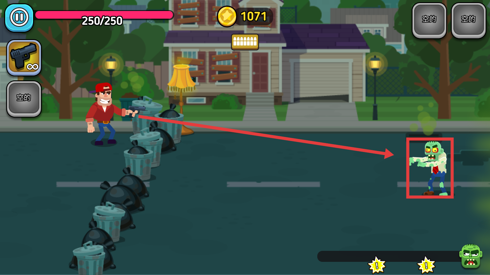 3、留意【血量-20/250】与【子弹】数量,合理规划射击节奏,应对僵尸持续进攻。