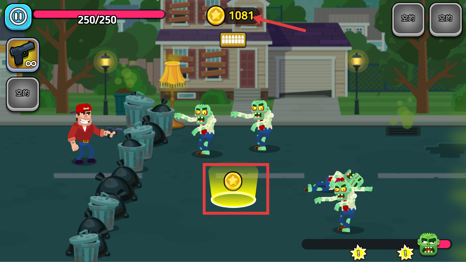 2、击杀【僵尸】后拾取掉落【金币】,金币数量增加,助力后续购买道具提升战力。
