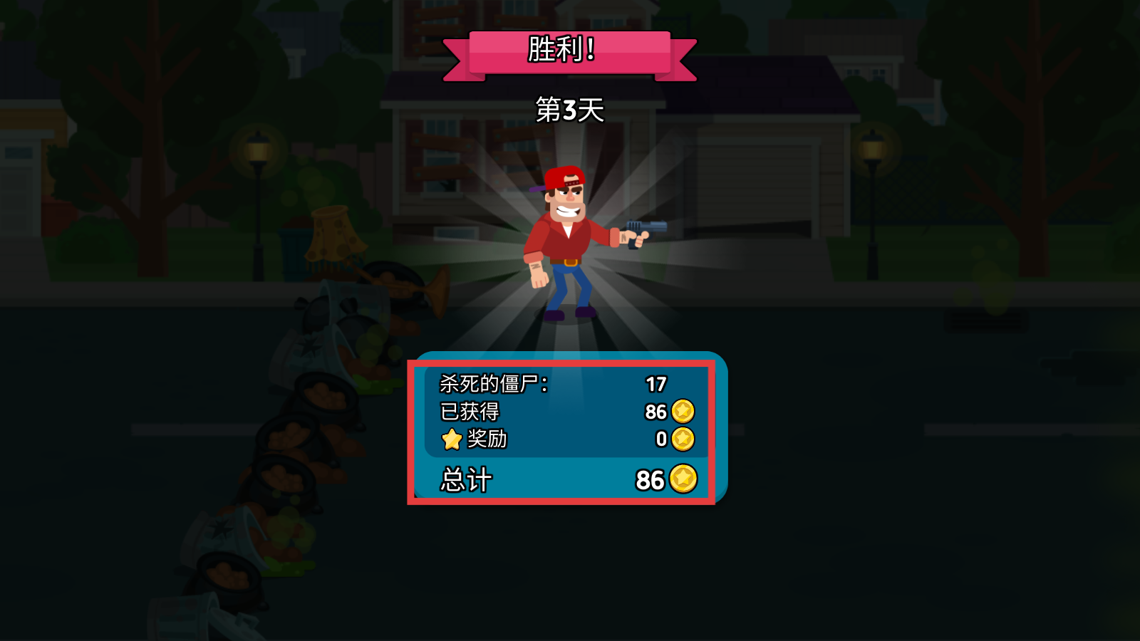 4、胜利后统计奖励,共杀【17-僵尸】获【86-金币】,推进至【第3天】,开启新挑战。