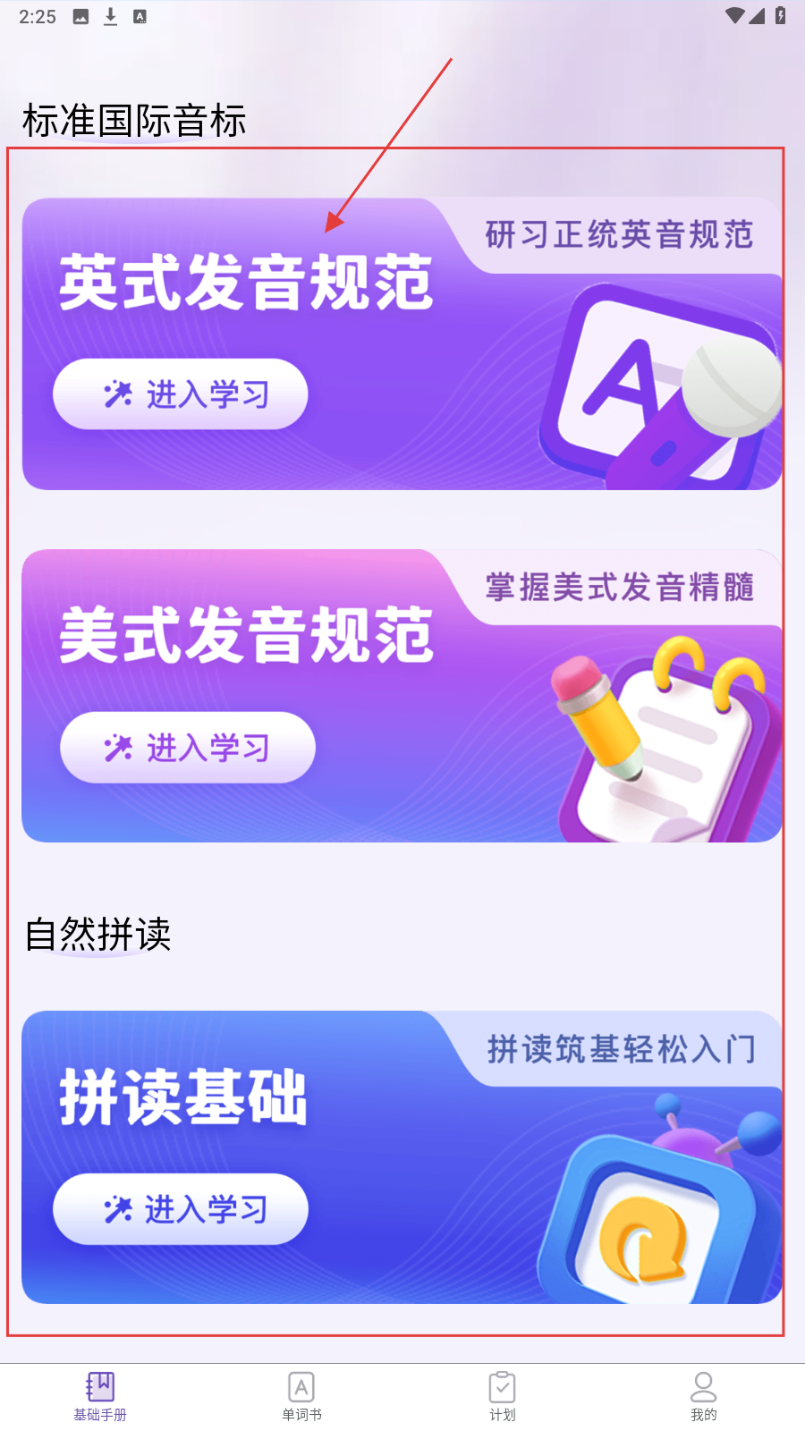 1、在首页选学习模块,如【英式发音规范-进入学习】,开启音标学习。