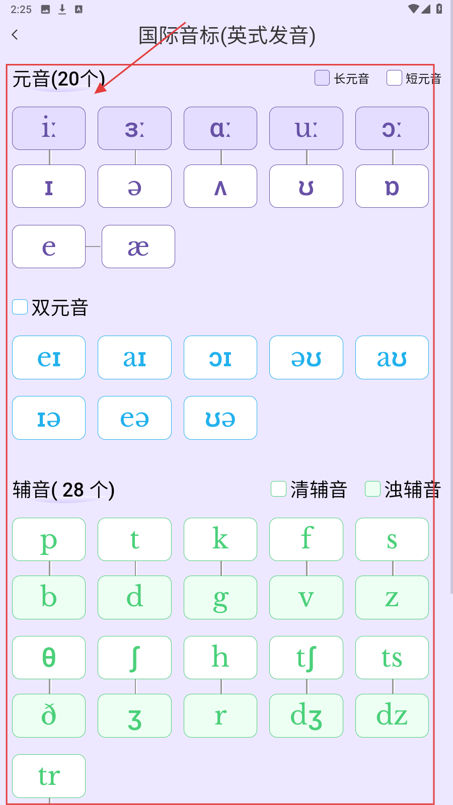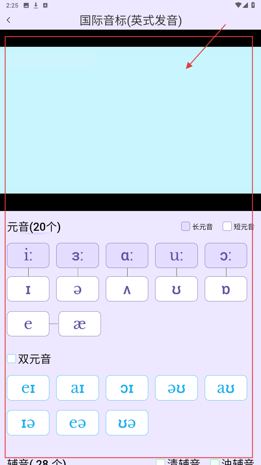 3、复习英式音标时,可滚动页面,巩固元音、辅音的分类和发音。
