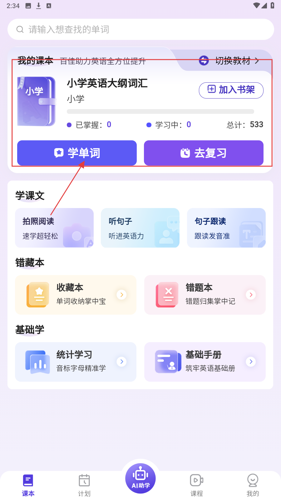 1、进入【课本】页,选【小学英语大纲词汇-学单词】,开启单词学习流程。