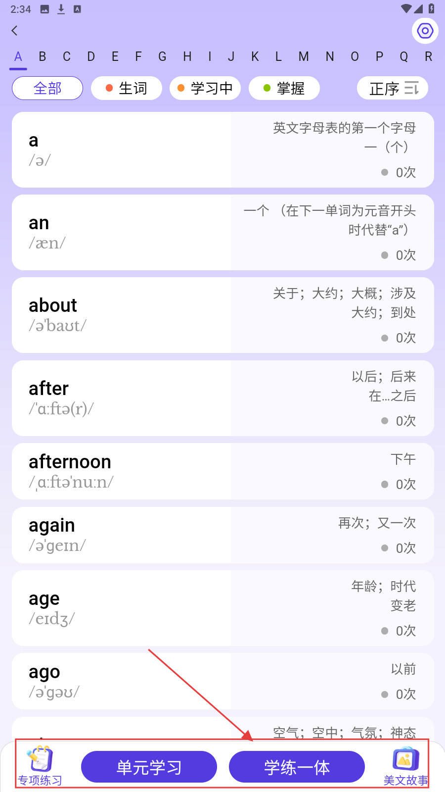 2、在单词列表,点击【学练一体】,进入单词综合学习模式。