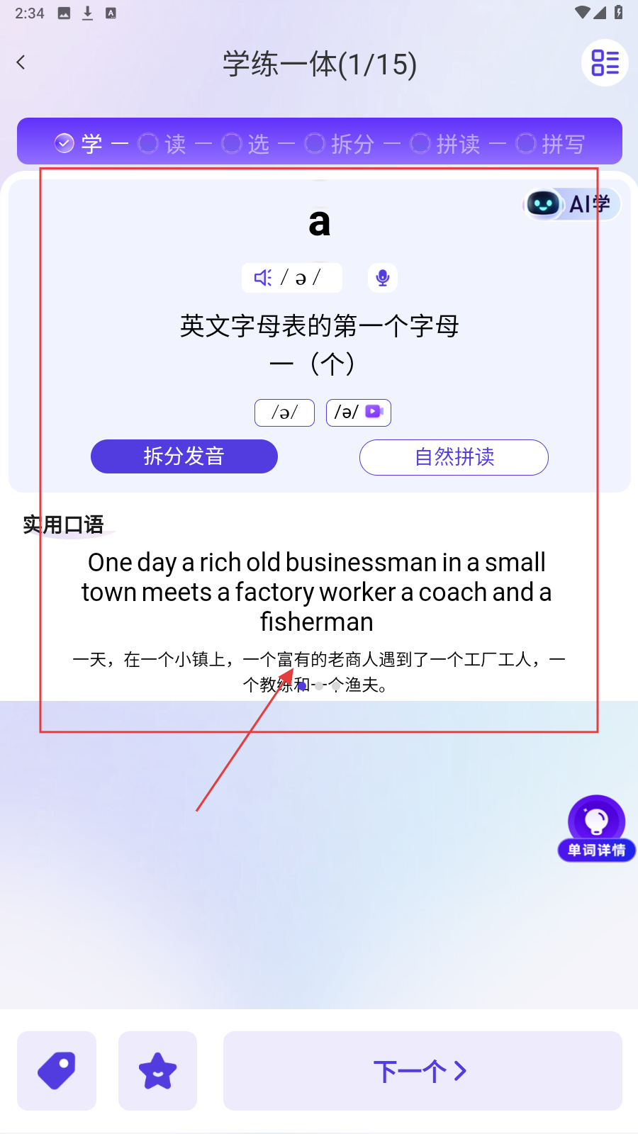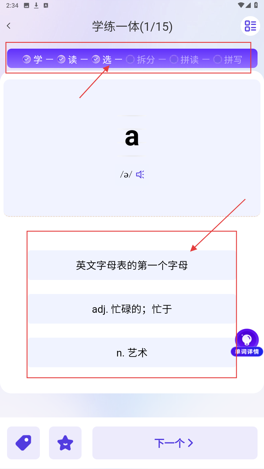4、完成基础学习,参与“选”环节,选对应释义巩固认知。