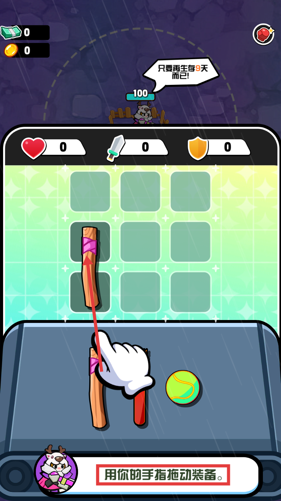 1、根据指引【拖动装备】到上方格子,完成初始装备布置,开启【9天】生存挑战的准备阶段。