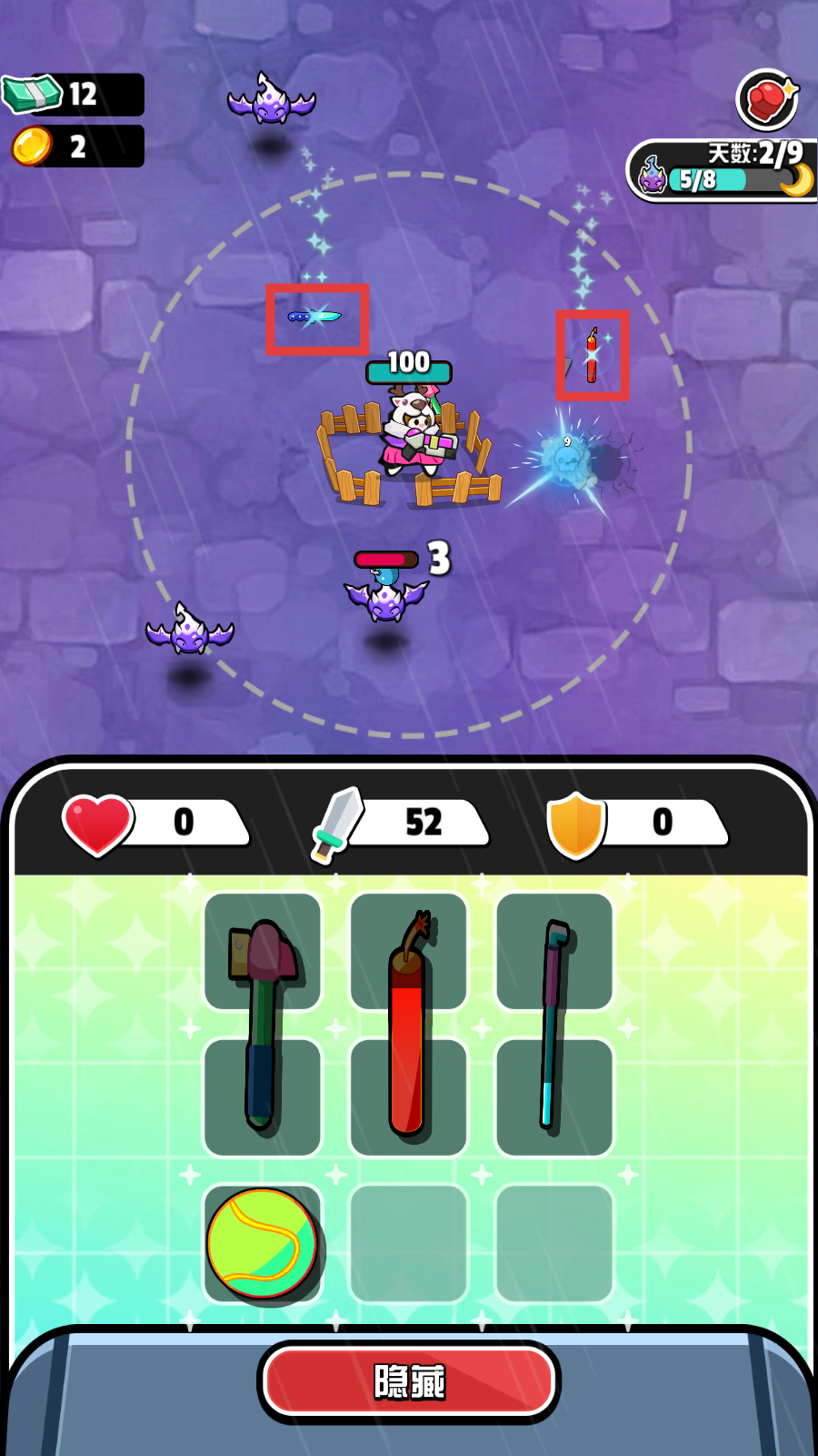 3、进入【天数-2/9】,合理搭配装备提升【攻击-52】,同时收集【钞票-12】【金币-2】等资源强化自身。