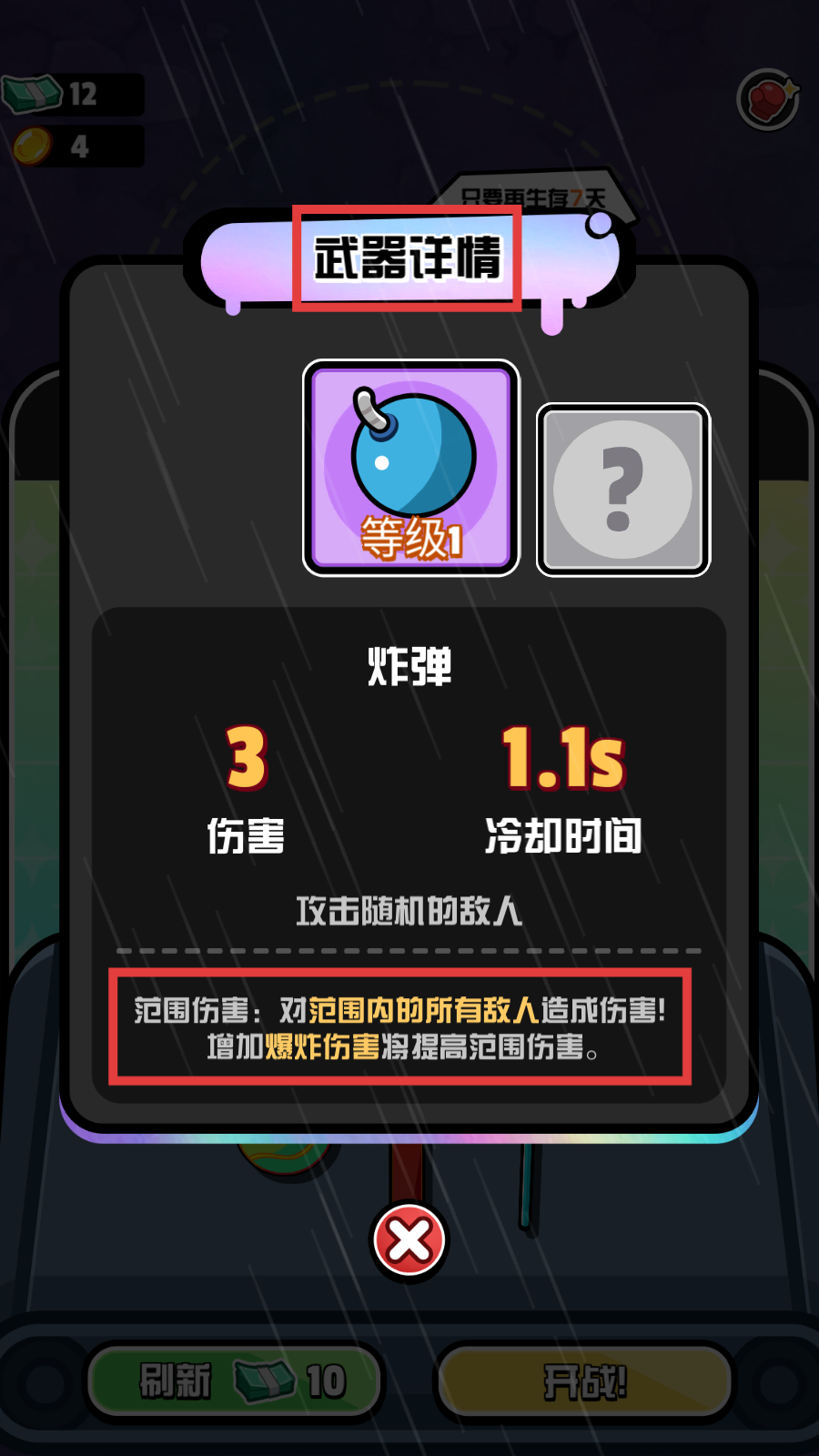 4、查看【武器详情】,了解【炸弹-等级1】的【范围伤害】效果,提升爆炸伤害可增强范围打击能力。