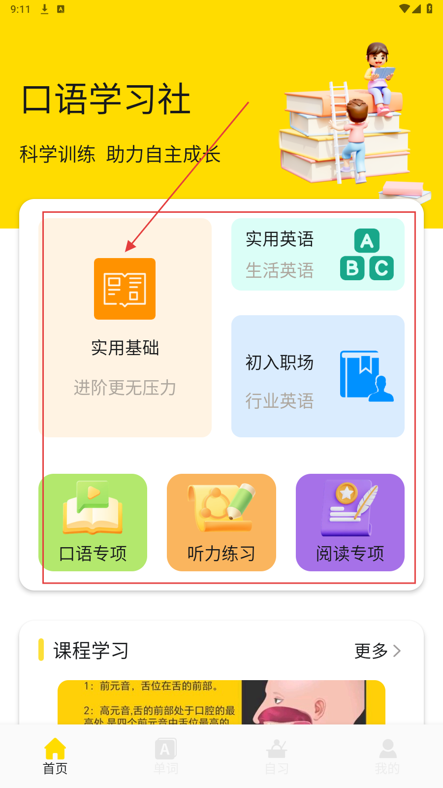 1、打开应用,在【首页】有实用基础、实用英语等功能,点击感兴趣的功能,如点击【实用基础】。