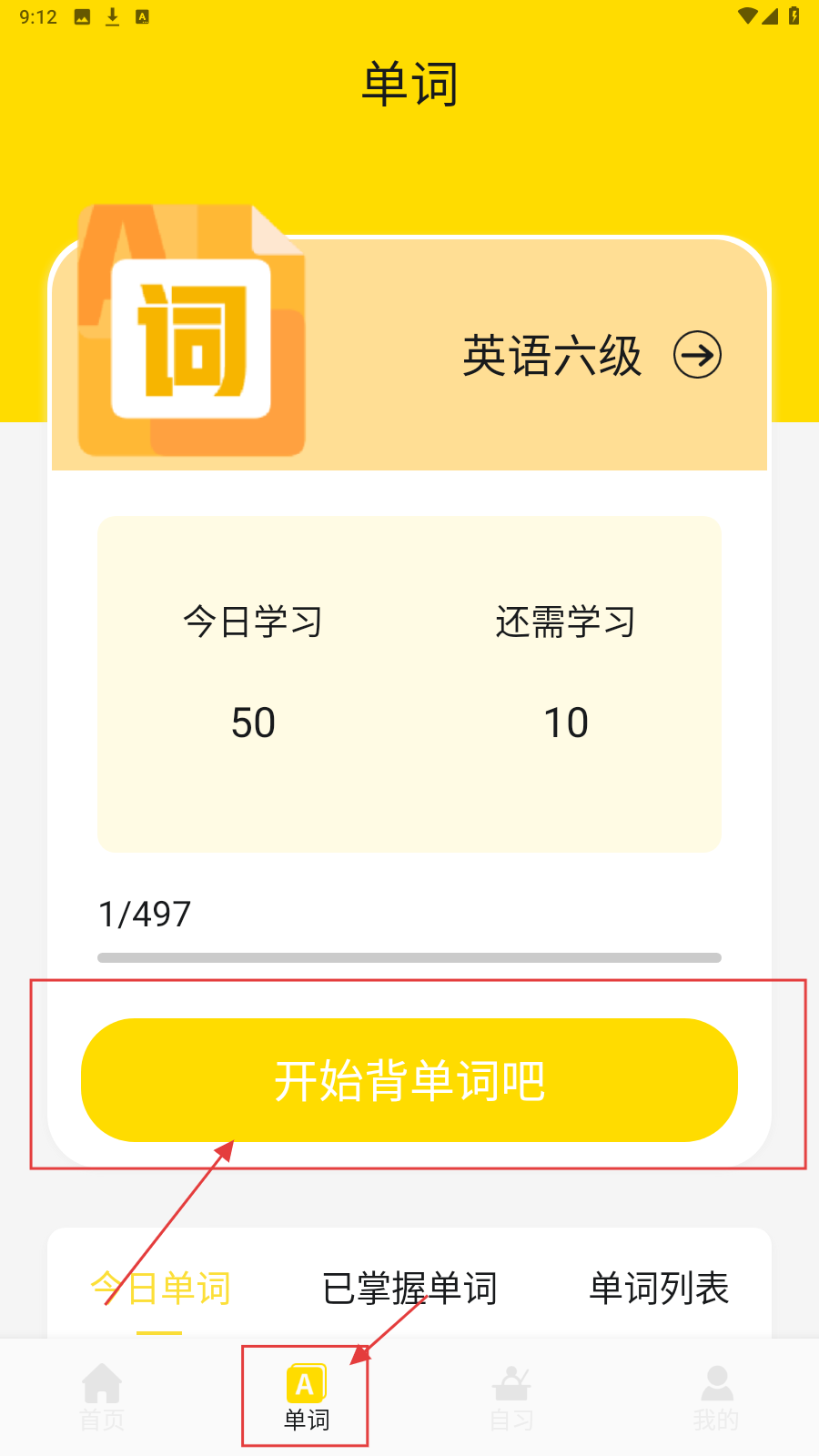 4、切换至【单词】页面,点击【开始背单词吧】进行单词背诵。