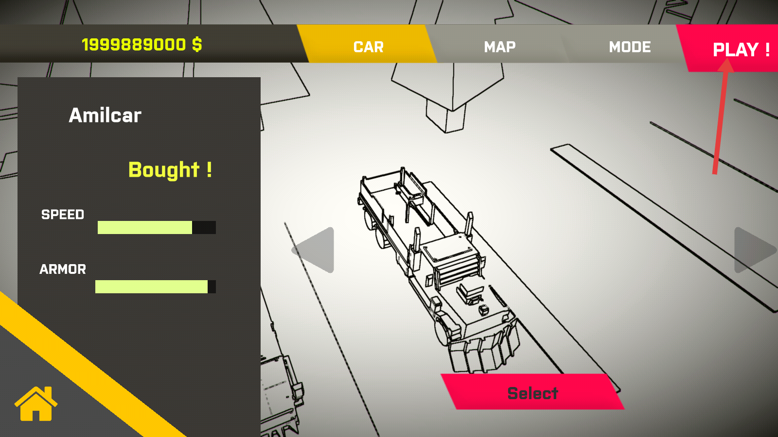 1、选择【Amilcar】车辆,其【SPEED】与【ARMOR】属性均衡,点击【PLAY!】开启竞速挑战。