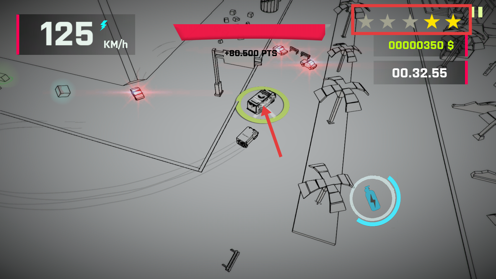 3、提速至【125-KM/h】时积极撞击得分,利用漂移积累【29K-PTS】,提升星级评价。