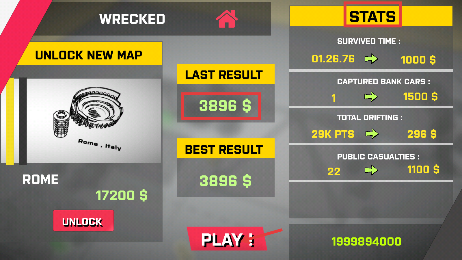 4、结算后用【3896-$】解锁【ROME-Italy】新地图,继续挑战刷新【LAST-RESULT】与【BEST-RESULT】。