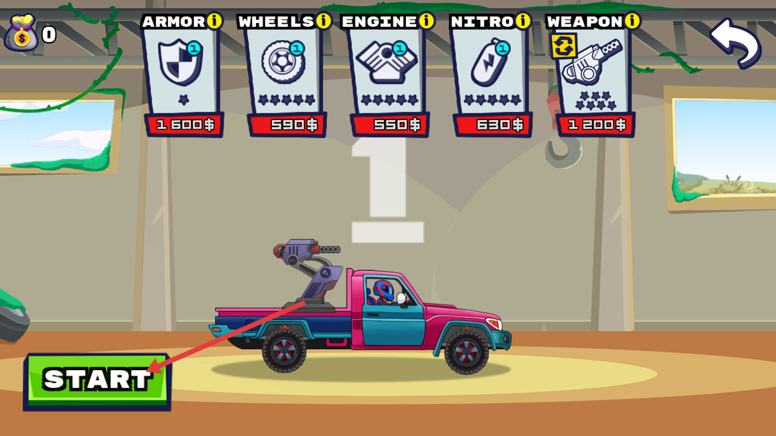 1、先查看【ARMOR】【WHEELS】等升级项,确认后点击绿色【START】按钮即可开启游戏挑战。