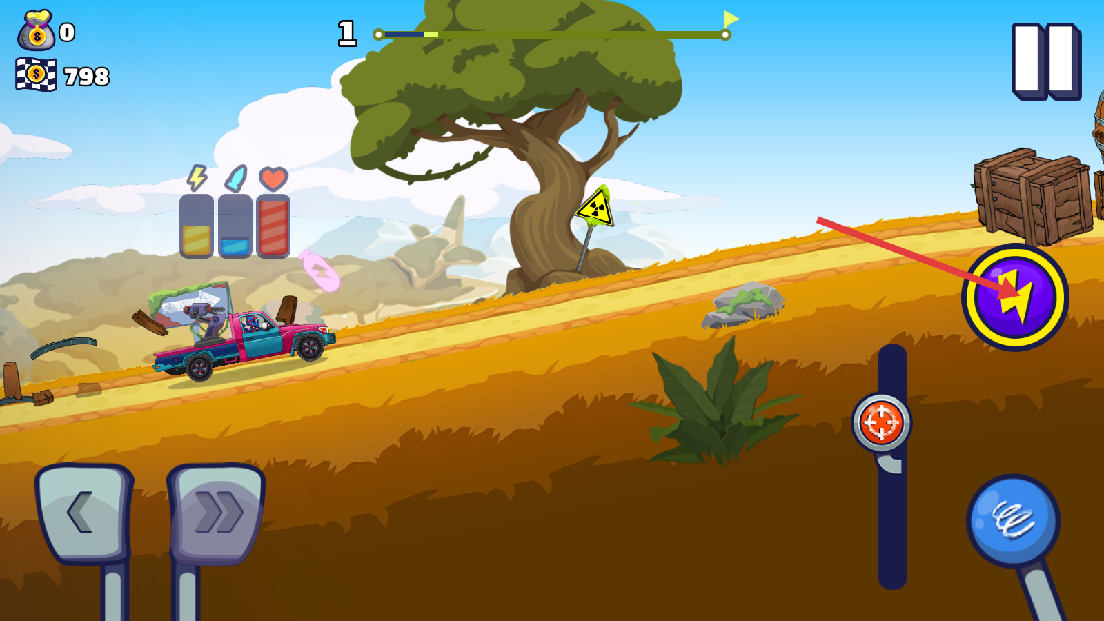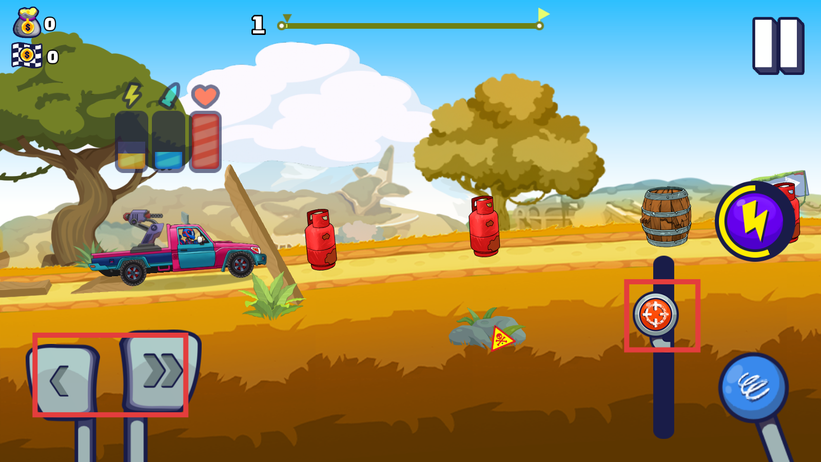 2、用左侧箭头键操控车辆移动,点击右侧瞄准键可攻击道路上的红色气罐等障碍物。