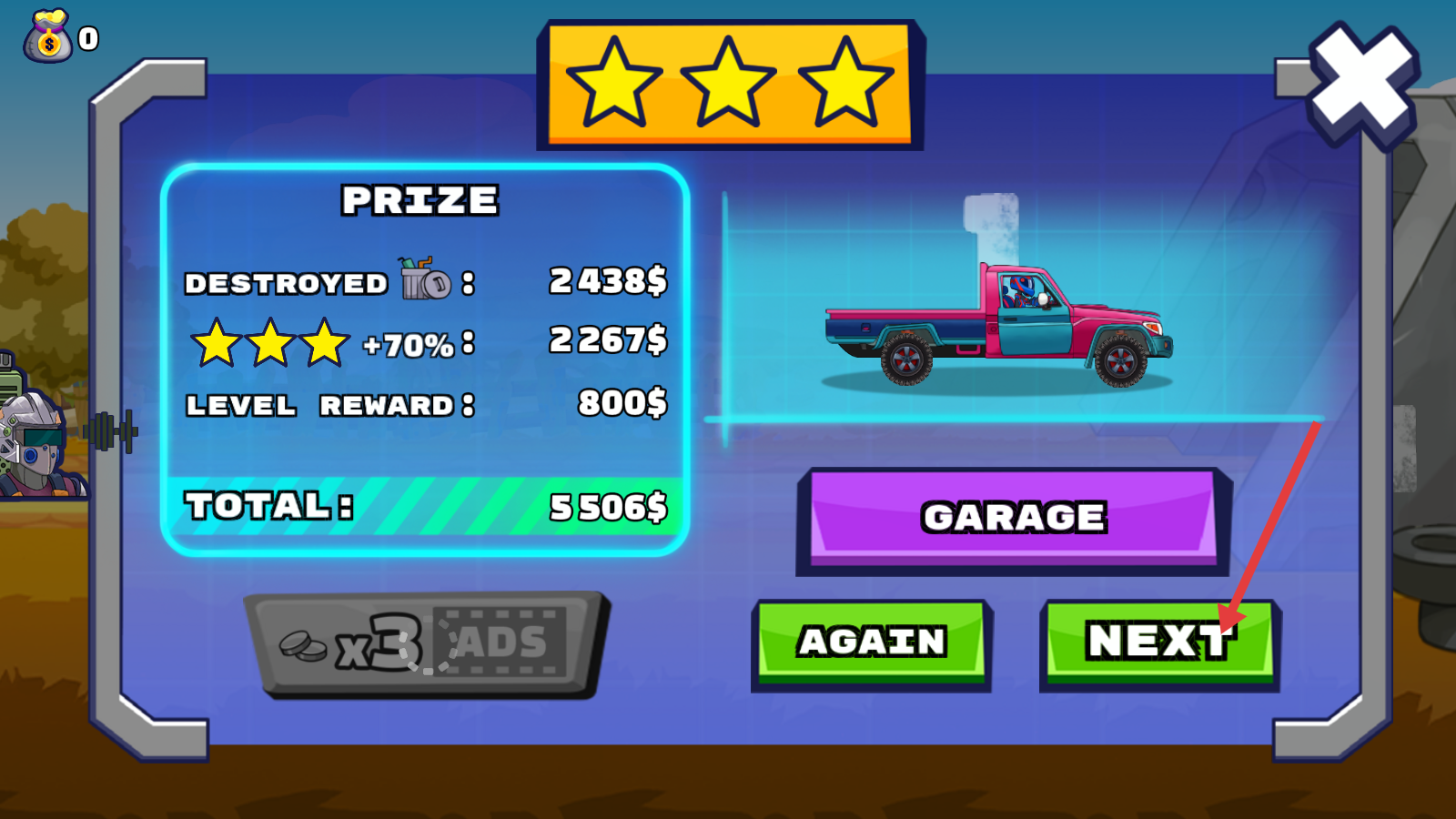 4、结算界面显示总奖励【5506$】,点击绿色【NEXT】按钮可进入下一关继续挑战。