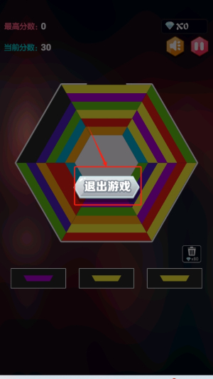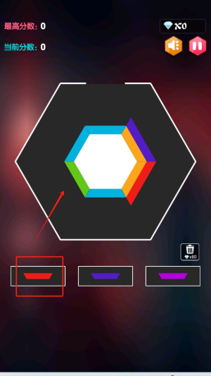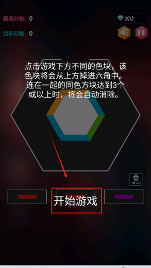 3、进行消除:点击下方的色块,使同色方块在六边形中连成三个或以上进行消除。