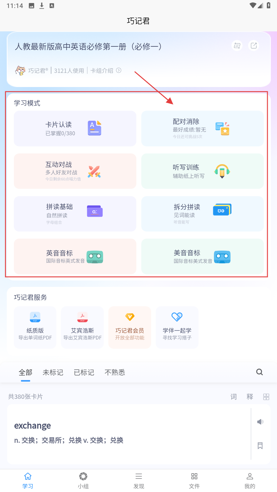 1、打开应用,在【学习】页面,选择学习模式,如点击【配对消除】。