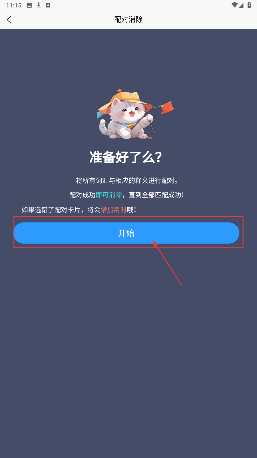 2、进入【配对消除】页面,查看规则,点击【开始】。
