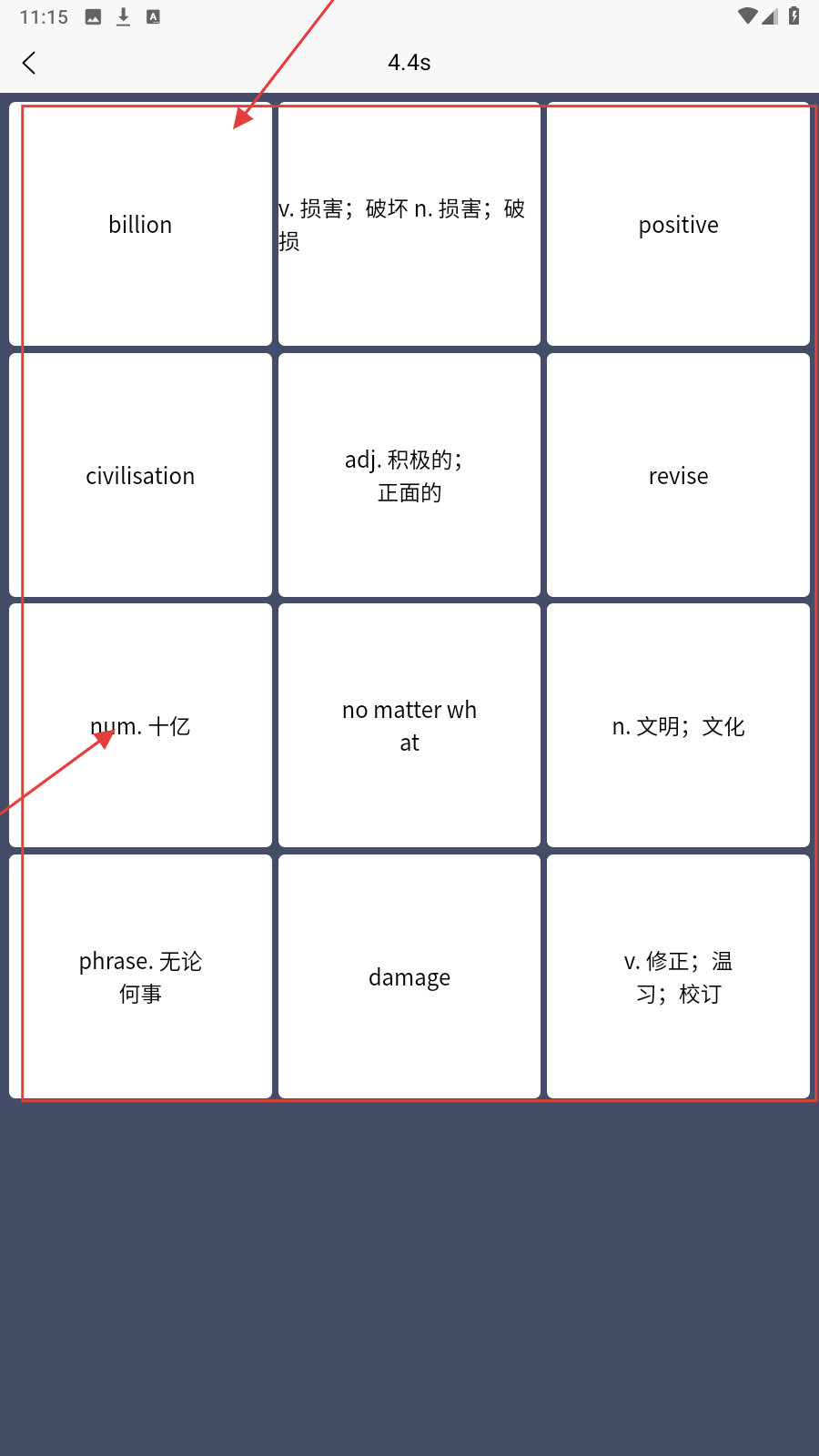 3、开始后,将单词与释义进行关联消除,如点击【billion】与【十亿】进行消除。