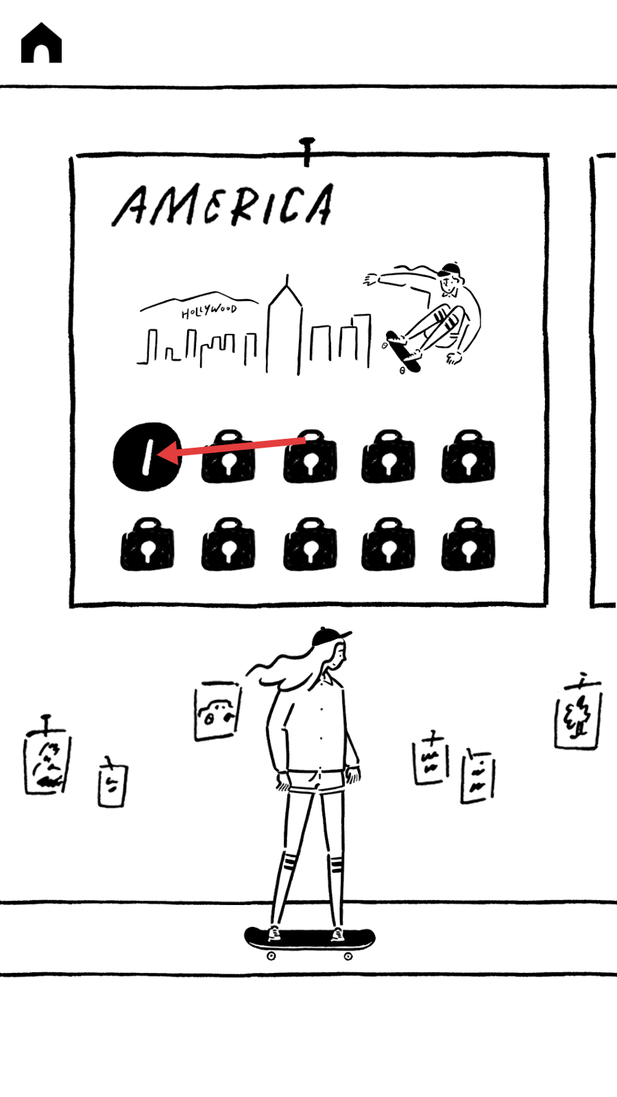 1、点击标有【1】的关卡按钮,进入【AMERICA】主题第一关,开启滑板冒险之旅探索好莱坞风格场景。
